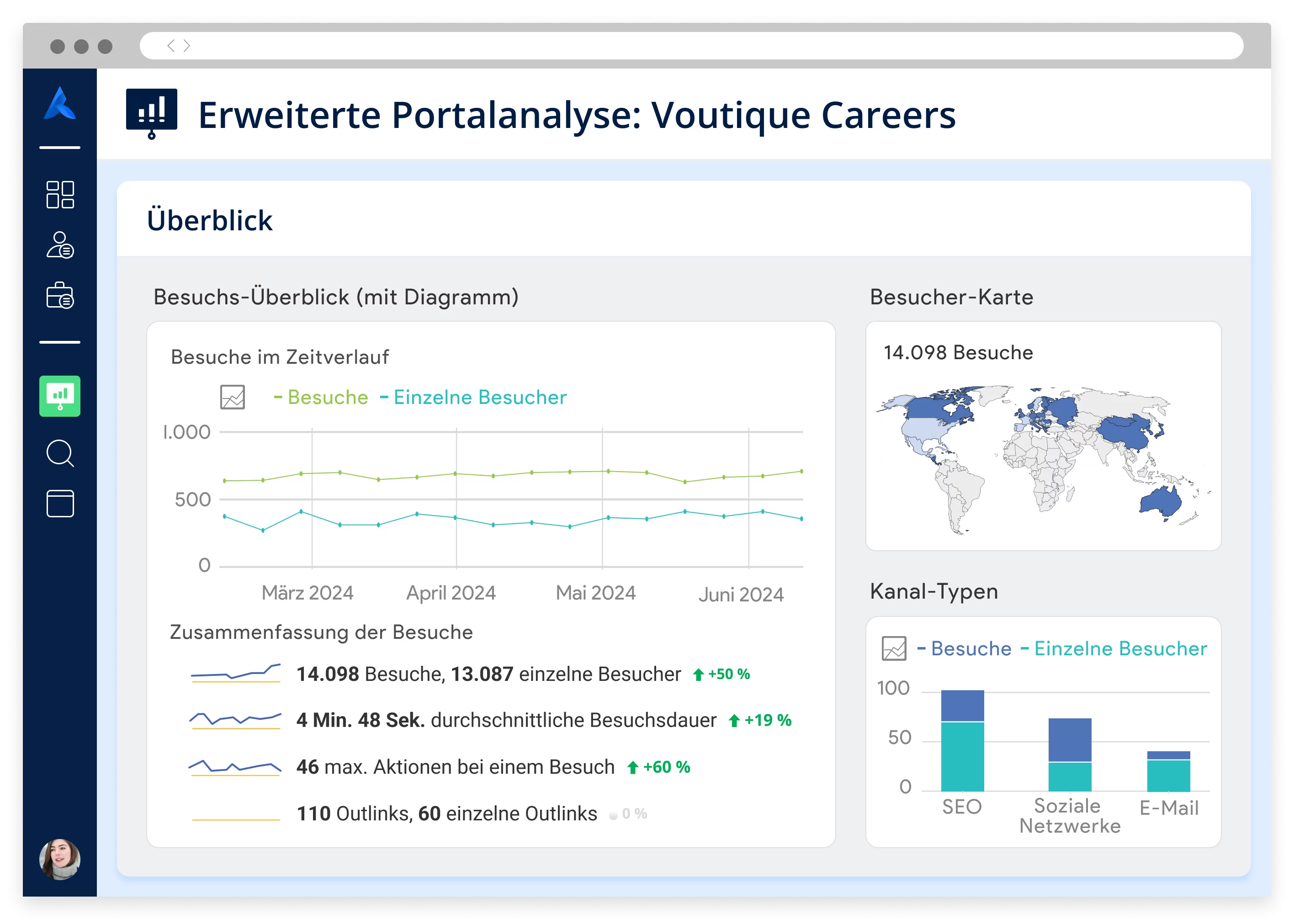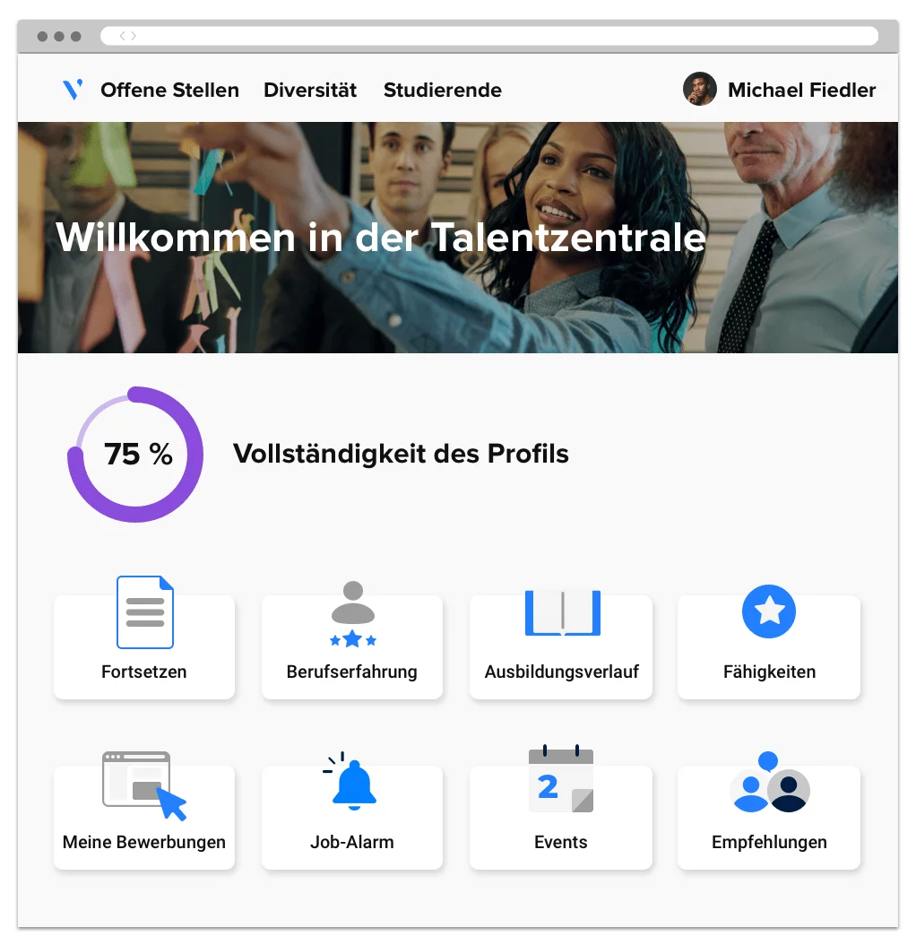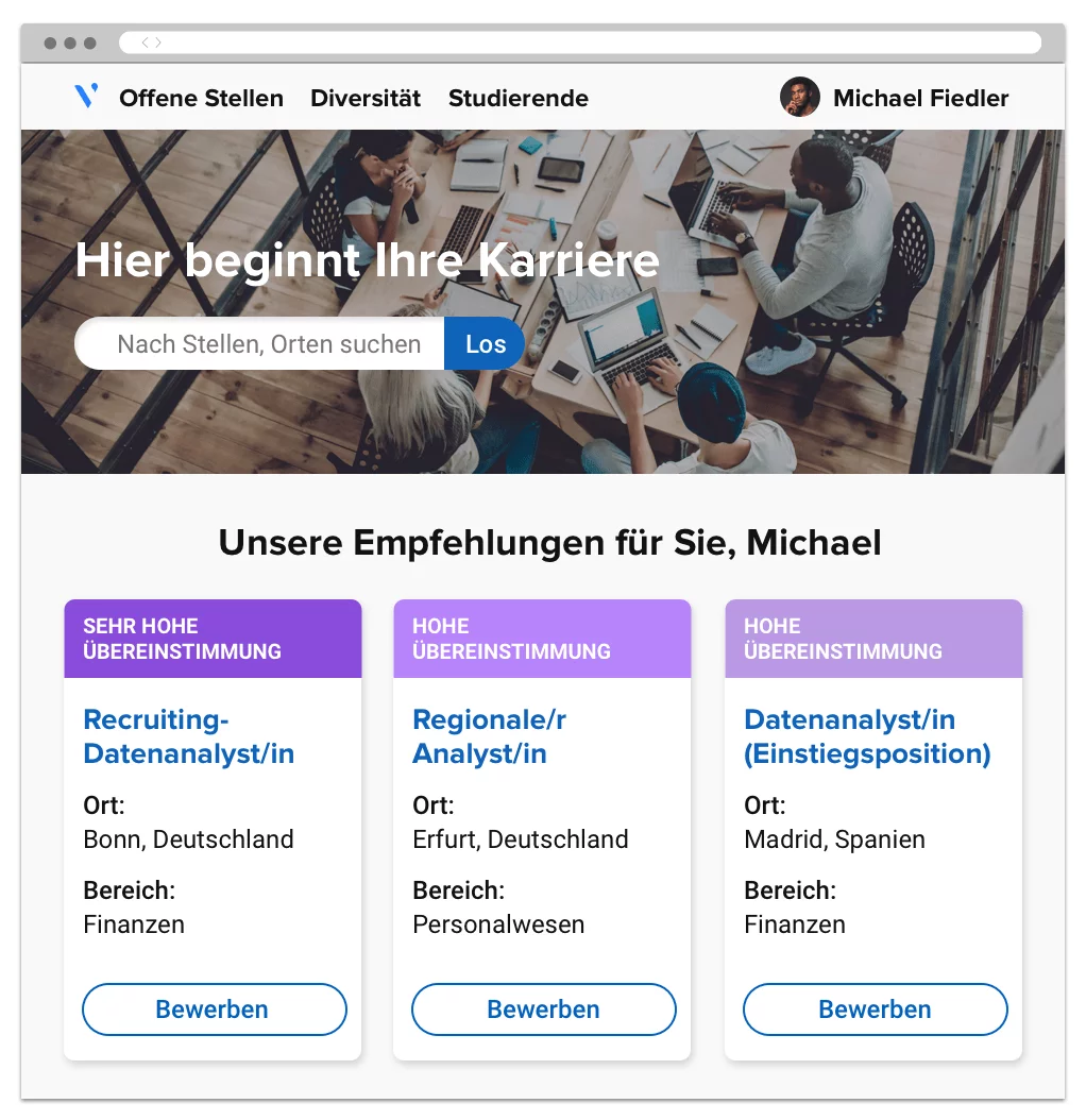 Bei der Erstellung von Karriereseiten mithilfe des Assistenten für Portal-Applikationen von Avature erhalten Sie unbegrenzte Design-Optionen, mit denen Sie das Erscheinungsbild Ihrer Unternehmenswebsite anpassen und maßgeschneiderte Bewerbungsprozesse für verschiedene Arten von Kandidaten gestalten können. Unser fortschrittliches Content Management System (CMS) macht es Ihrem Team leicht, Rich-Media-Inhalte zu verwalten, während die Avature KI-Engine Stellenangebote vorschlägt, die den Profilen der Stellensuchenden entsprechen. Darüber hinaus hat Ihr Team die Möglichkeit, Stellen für das Suchmaschinen-Ranking zu optimieren und integrierte Screening- und Umfrage-Tools zu nutzen, um Top-Talente schneller zu qualifizieren.
