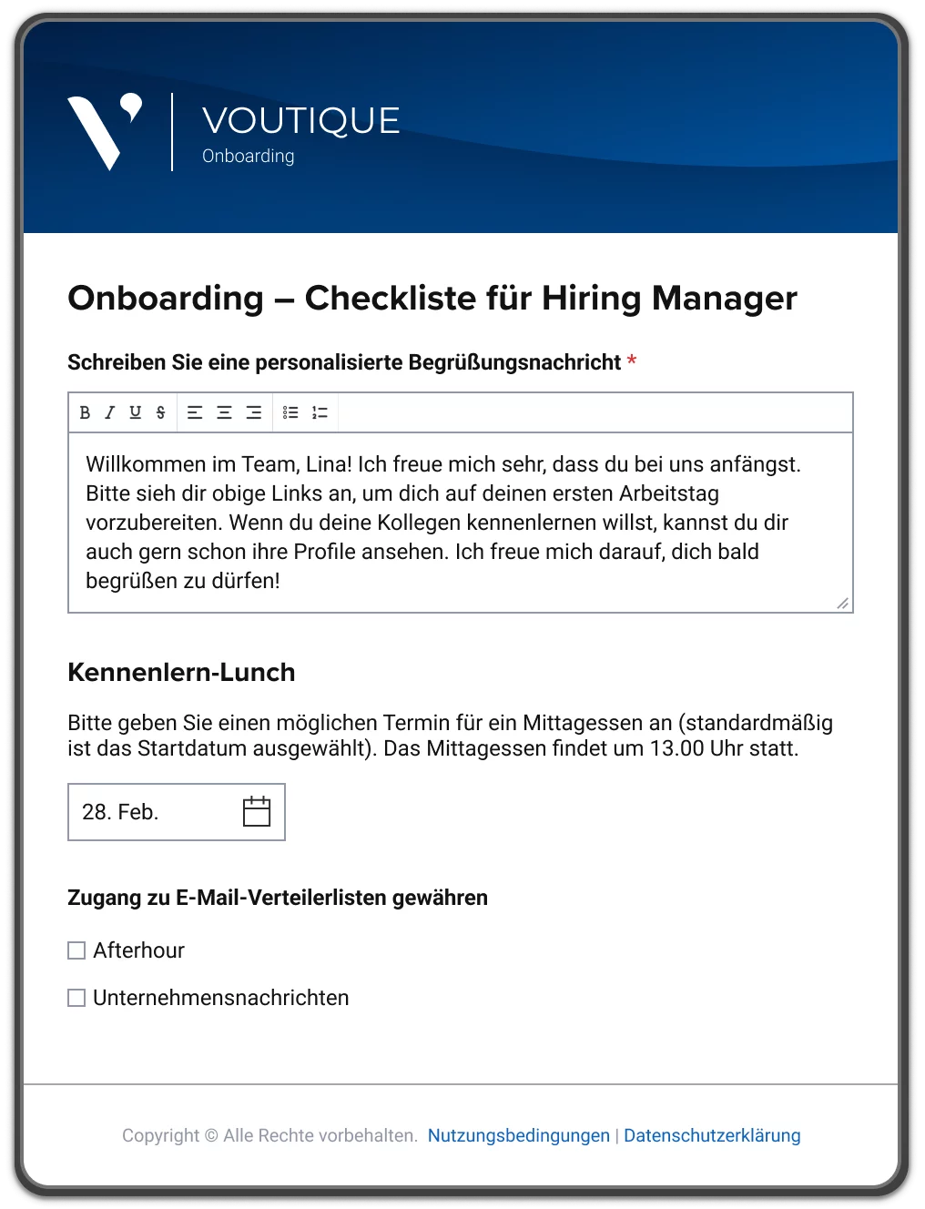 Schaffen Sie auch für zurückkehrende Mitarbeiter, Mitarbeiter, die ihre Stelle wechseln, Führungskräfte und Angestellte im Homeoffice einzigartige Erlebnisse und erfassen Sie für wichtige Daten zum Recruiting-Erfolg und zur Einarbeitungszeit.