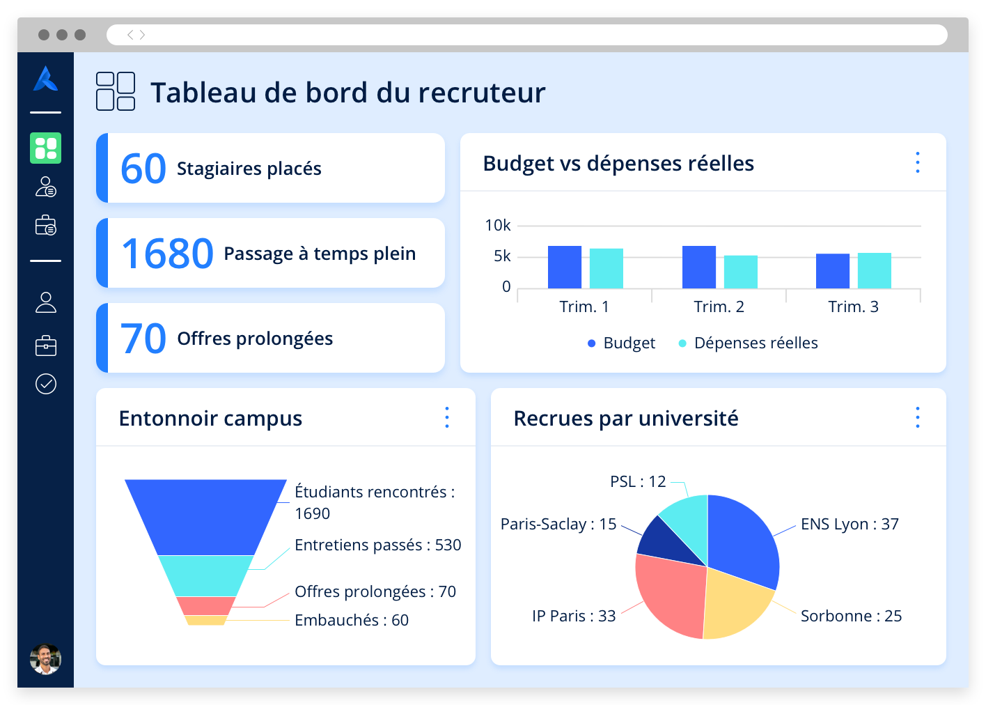 Utilisez nos rapports intégrés en temps réels pour mesurer l’activité du pipeline, l’analytique de campagnes d’e-mail, les indicateurs de coût par rapport au budget, les délais nécessaires au recrutement, l’analytique de conversion des candidats ainsi que la performance des événements et des programmes. Offrez à chaque utilisateur une vue d’ensemble ciblée grâce aux tableaux de bord personnalisables.