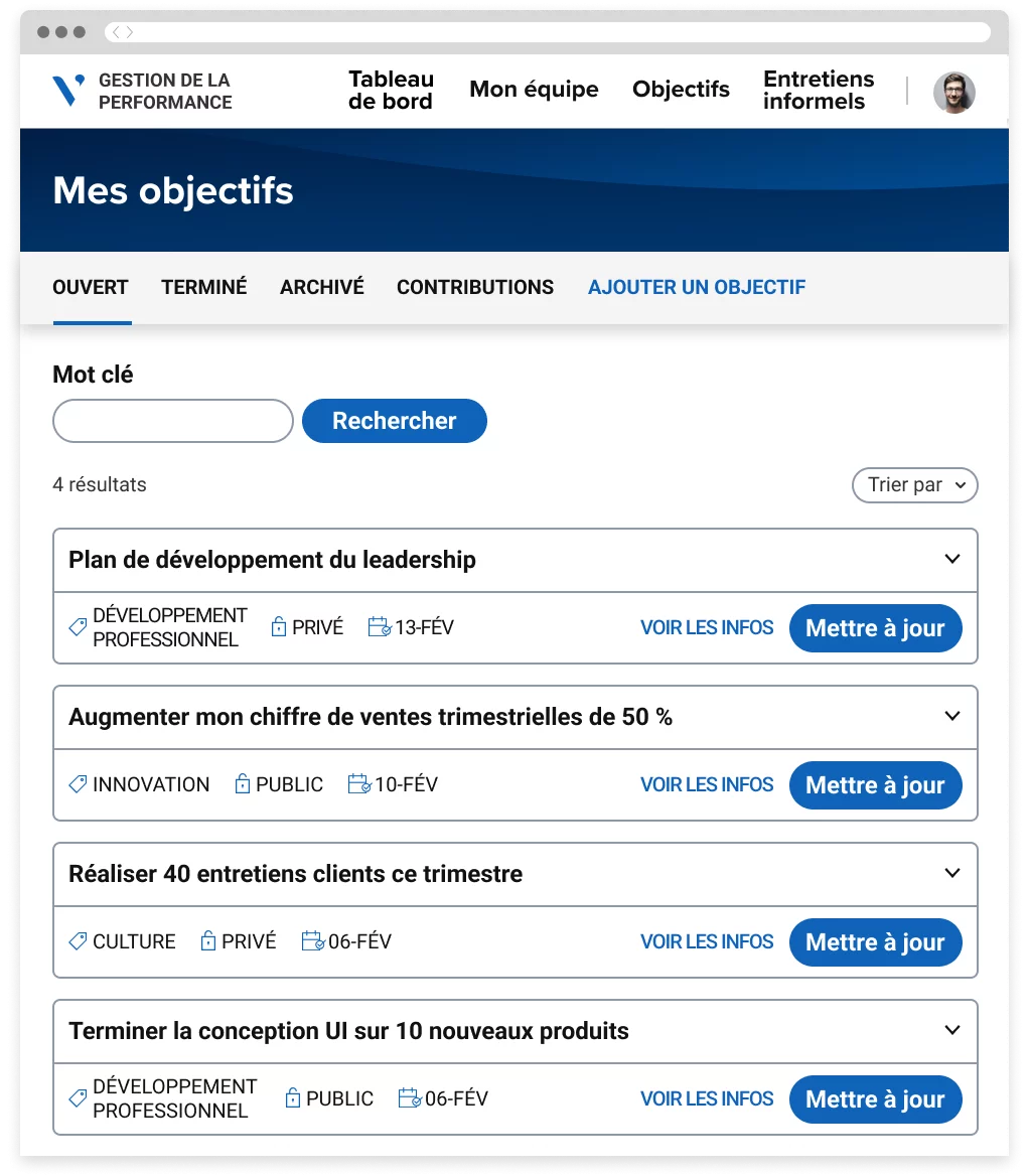 Avec Avature Performance Management, les employés peuvent facilement définir et suivre leurs objectifs et leurs résultats clés. Valorisez la culture de la transparence et de la collaboration avec la publication ouverte des objectifs et des rapports d’état d’avancement. Si besoin est, modifiez les objectifs pour être en adéquation avec les évolutions de l’entreprise/du marché.