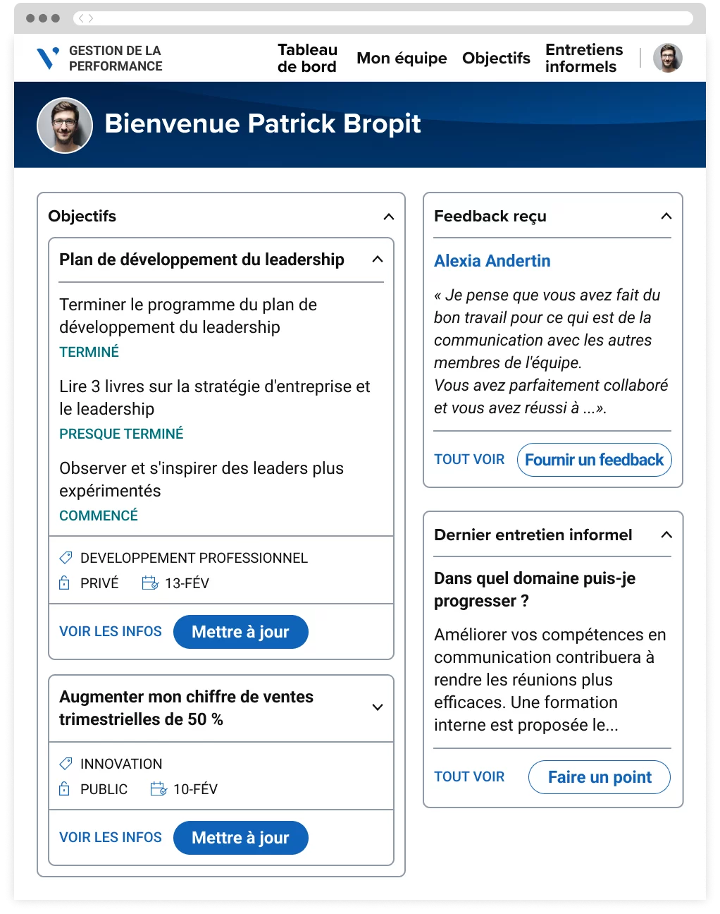 En combinant Avature Performance Management avec Avature Employee Engagement (réseau social d’entreprise), vous pouvez promouvoir la notion de haute-performance en partageant publiquement les réussites, les promotions et les résultats clés marquants. En outre, les collègues peuvent publiquement se saluer pour des actions en lien avec les valeurs fondamentales de votre entreprise, renforçant ainsi les comportements souhaités. Vous pouvez également promouvoir le développement continu grâce à des opportunités d’apprentissage et de mobilité ciblées, établies sur les compétences, les intérêts et les domaines de développement des employés.