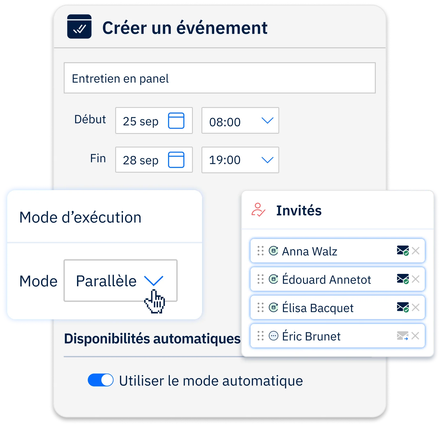 L’automatisation intelligente recueille les disponibilités de manière séquentielle ou simultanée, offre un matching manuel ou automatisé, et gère la reprogrammation et les annulations sans intervention de l’utilisateur.